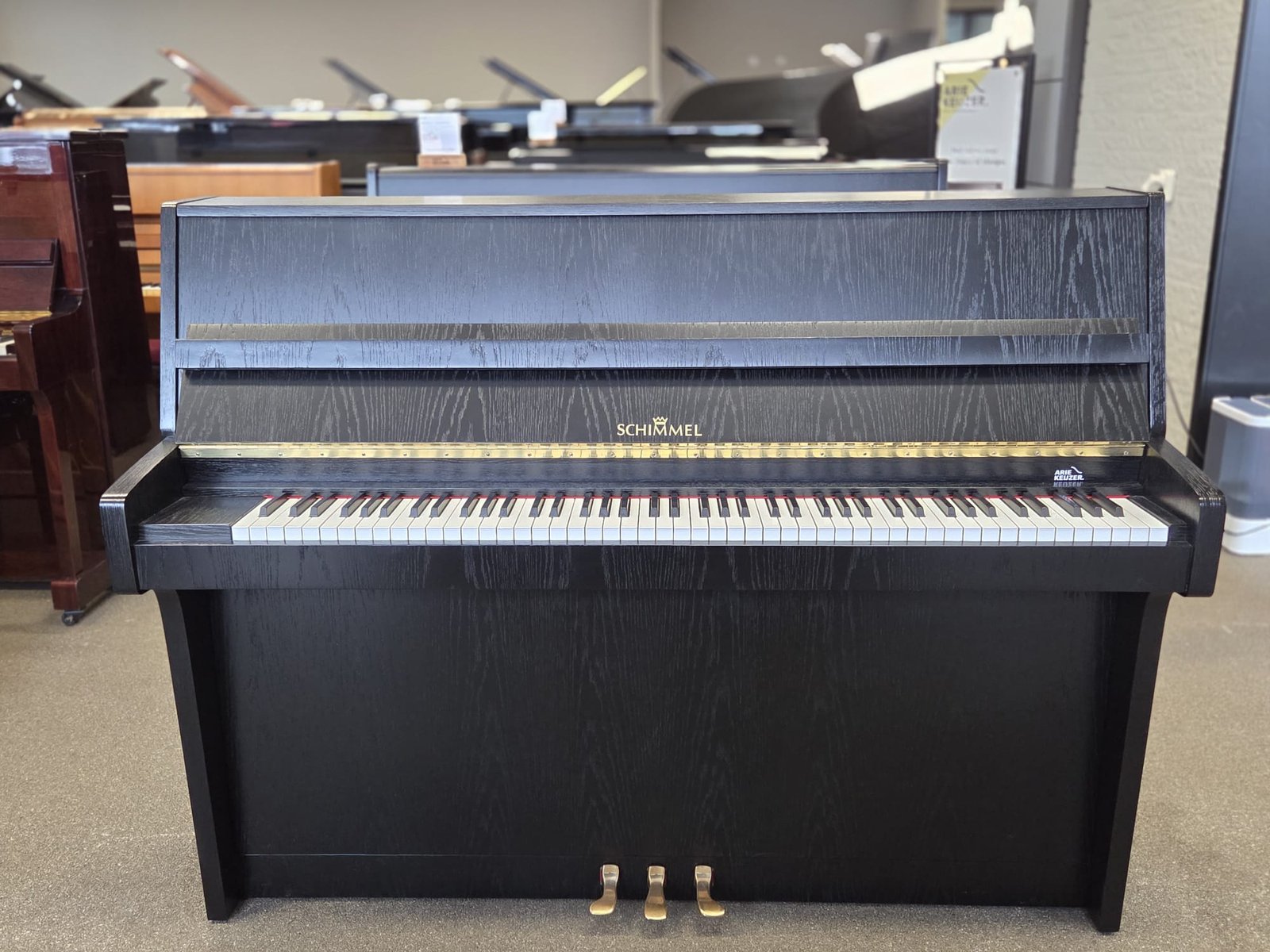 Een prachtige zwart zijdeglans Schimmel piano met houtnerf, een stijlvolle en hoogwaardige piano die elke ruimte een luxe uitstraling geeft. Dankzij de compacte hoogte van 112 cm is hij perfect voor kleinere ruimtes, zonder in te leveren op klank en speelcomfort. De piano beschikt over drie pedalen en een hoogwaardige Renner mechaniek, wat zorgt voor een fijne en responsieve speelervaring.