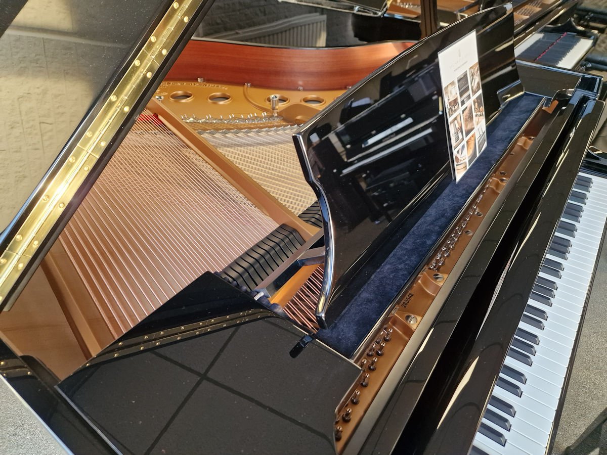 De vleugel is uitgevoerd in een elegante zwart hoogglans afwerking, wat zorgt voor een klassieke en luxueuze uitstraling. Een instrument dat niet alleen muzikaal indruk maakt, maar ook visueel een absolute blikvanger is.